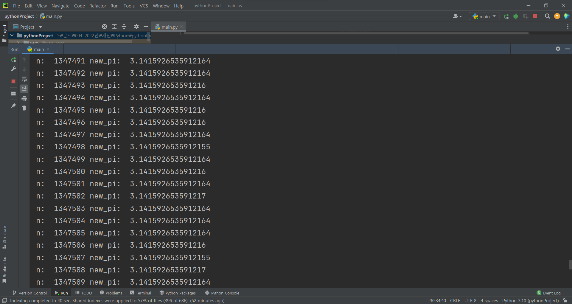 이제 여기서 "허용오차" (err) 의 값을 줄이시면 더욱 정확한 원주율을 계산할 수 있습니다.