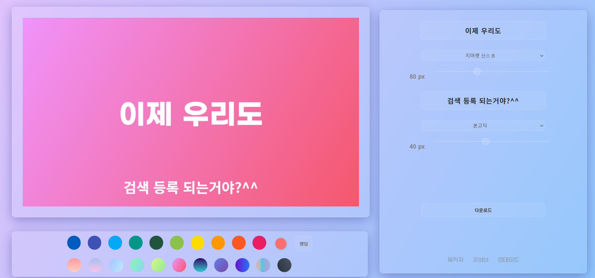 | [🎨 썸네일 메이커] 업데이트 - 그라데이션 배경 (2) | 2022.02.26 |