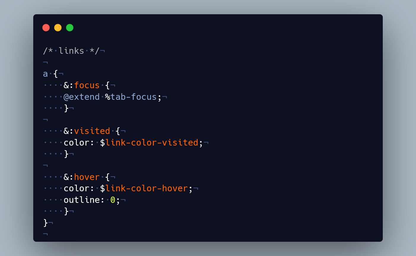 1 2 3 4 5 6 7 8 9 10 11 12 13 14 15 16 17 18 19 | /* links */ a { text-decoration-line: none; &:focus { @extend %tab-focus; } &:visited { color: $link-color-visited; } &:hover { color: $link-color-hover; outline: 0; } } | cs |